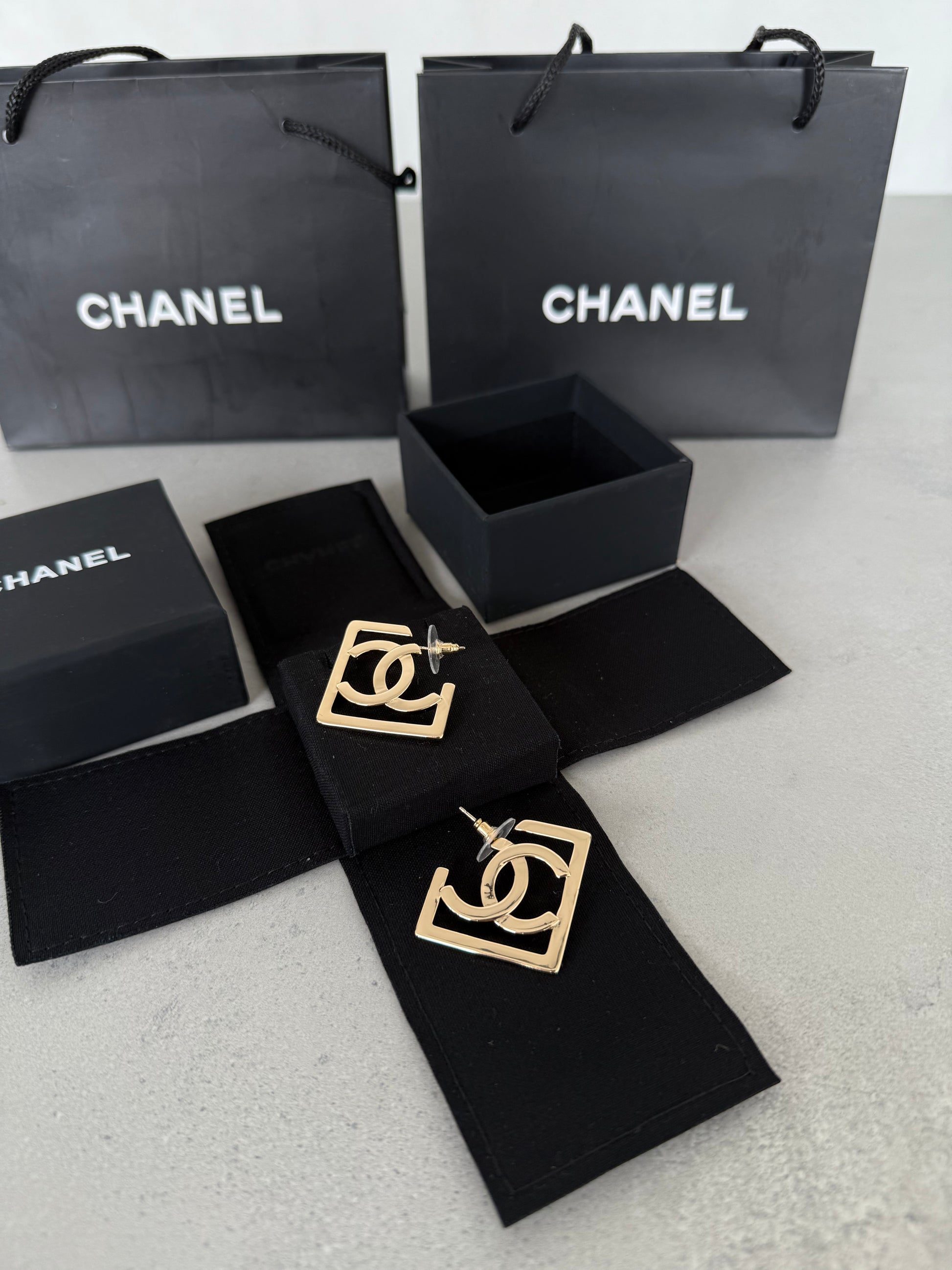Aretes CC logo dorado en marco geométrico