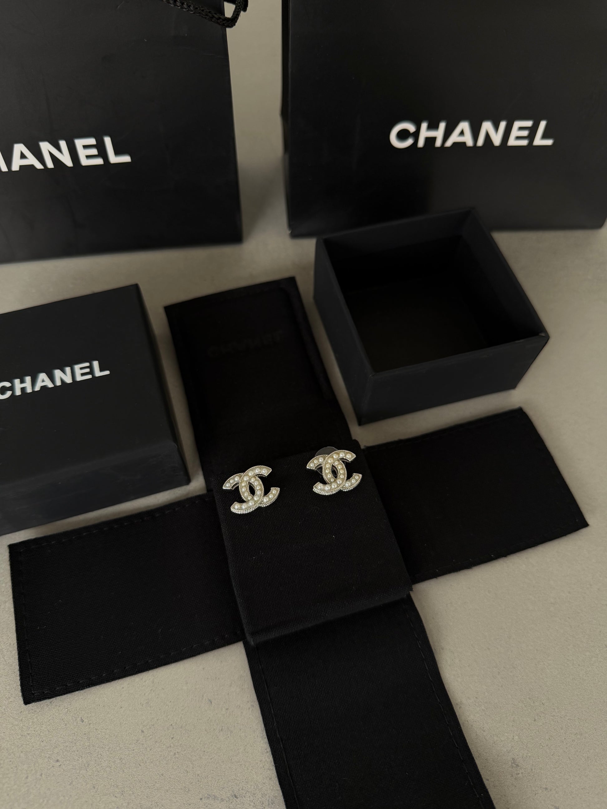 Aretes CC plateado y perlas