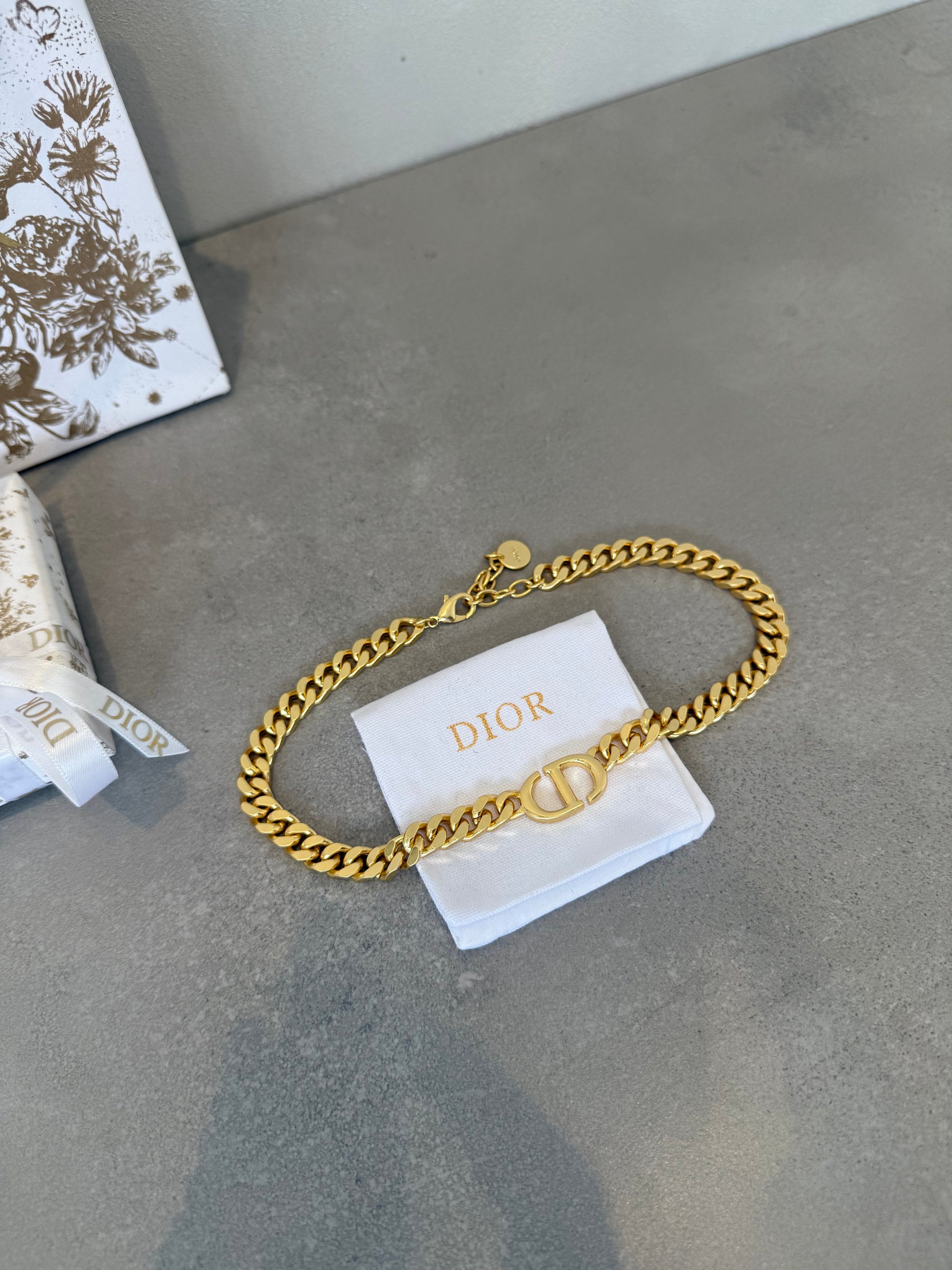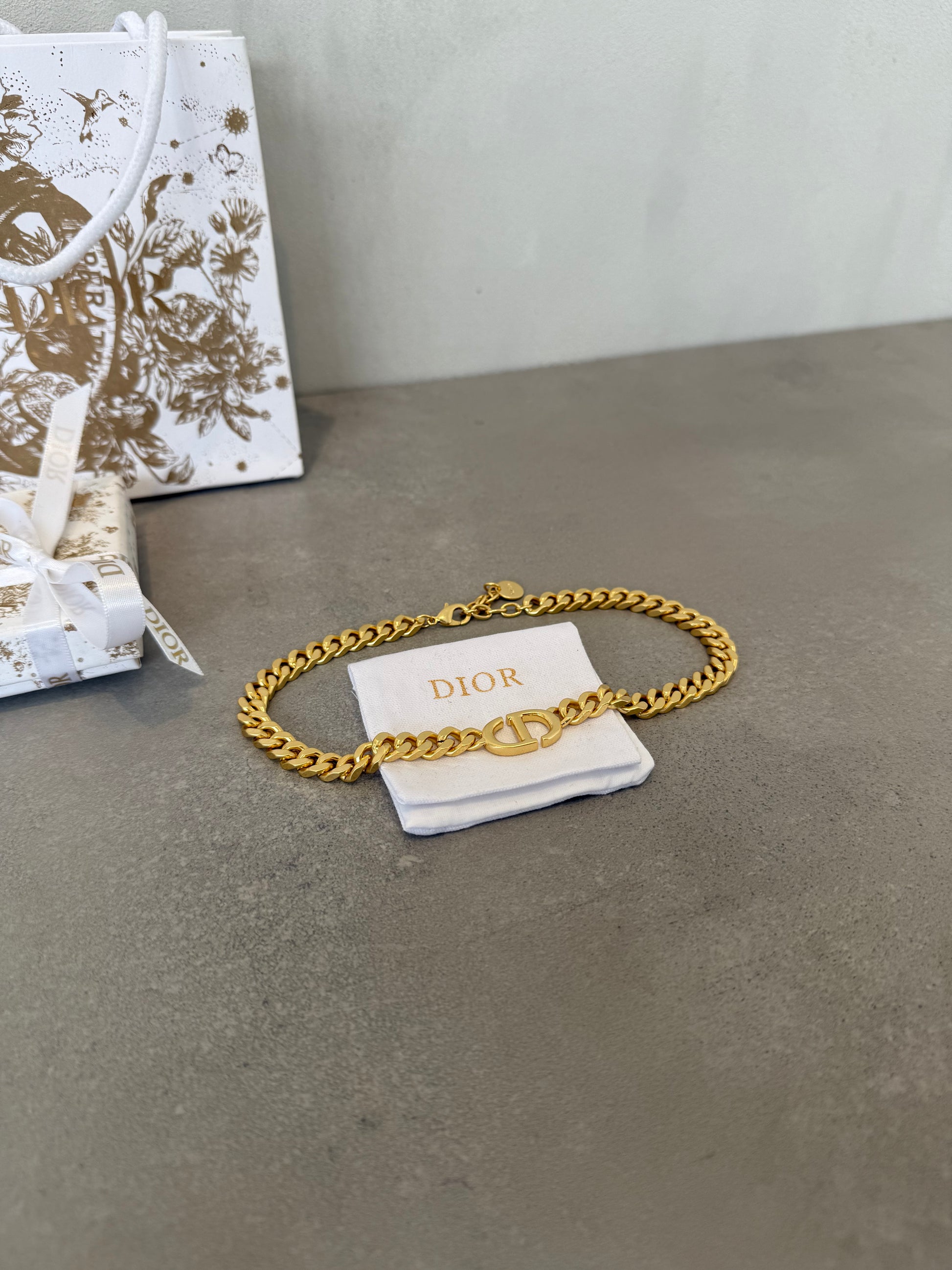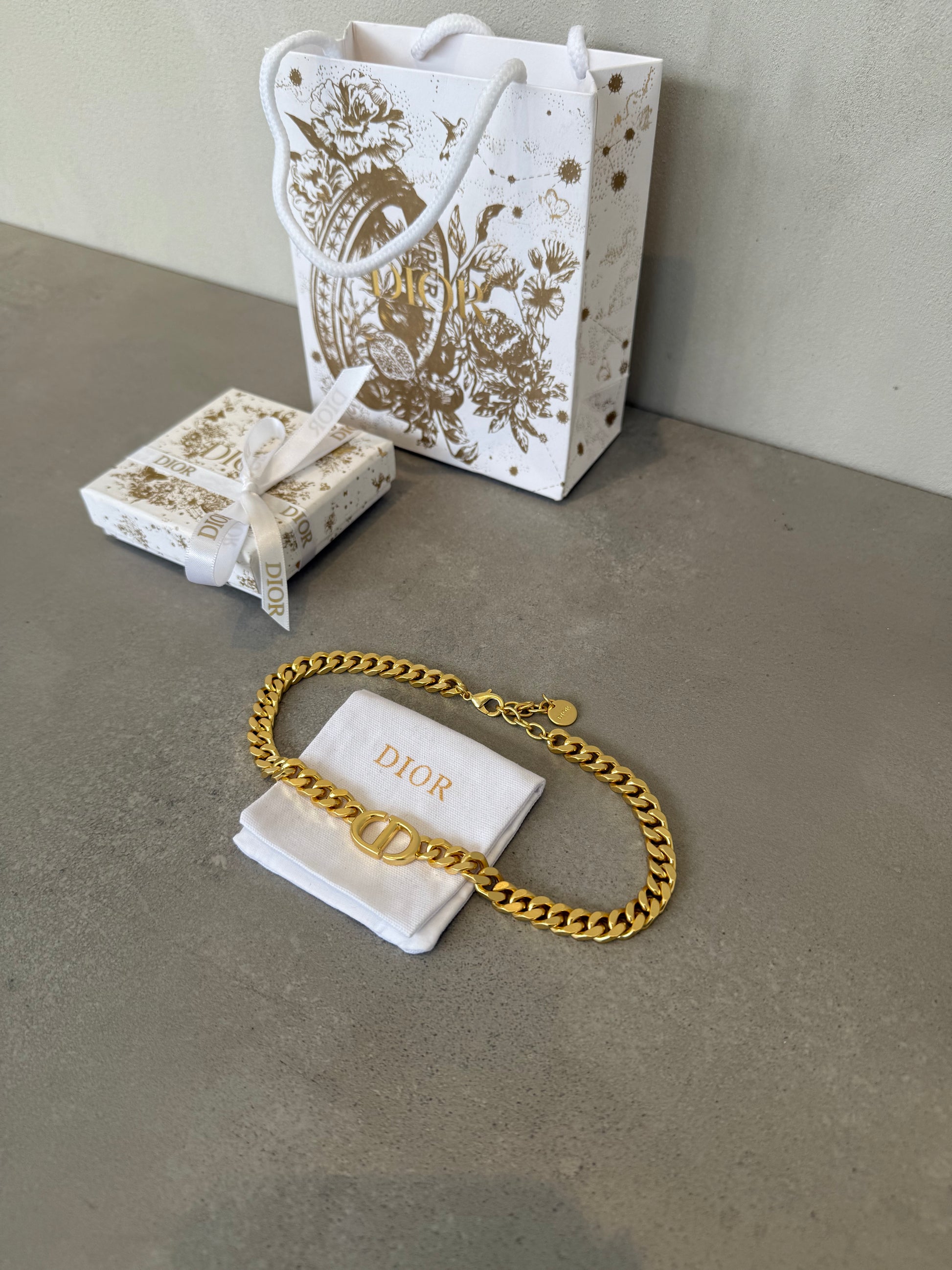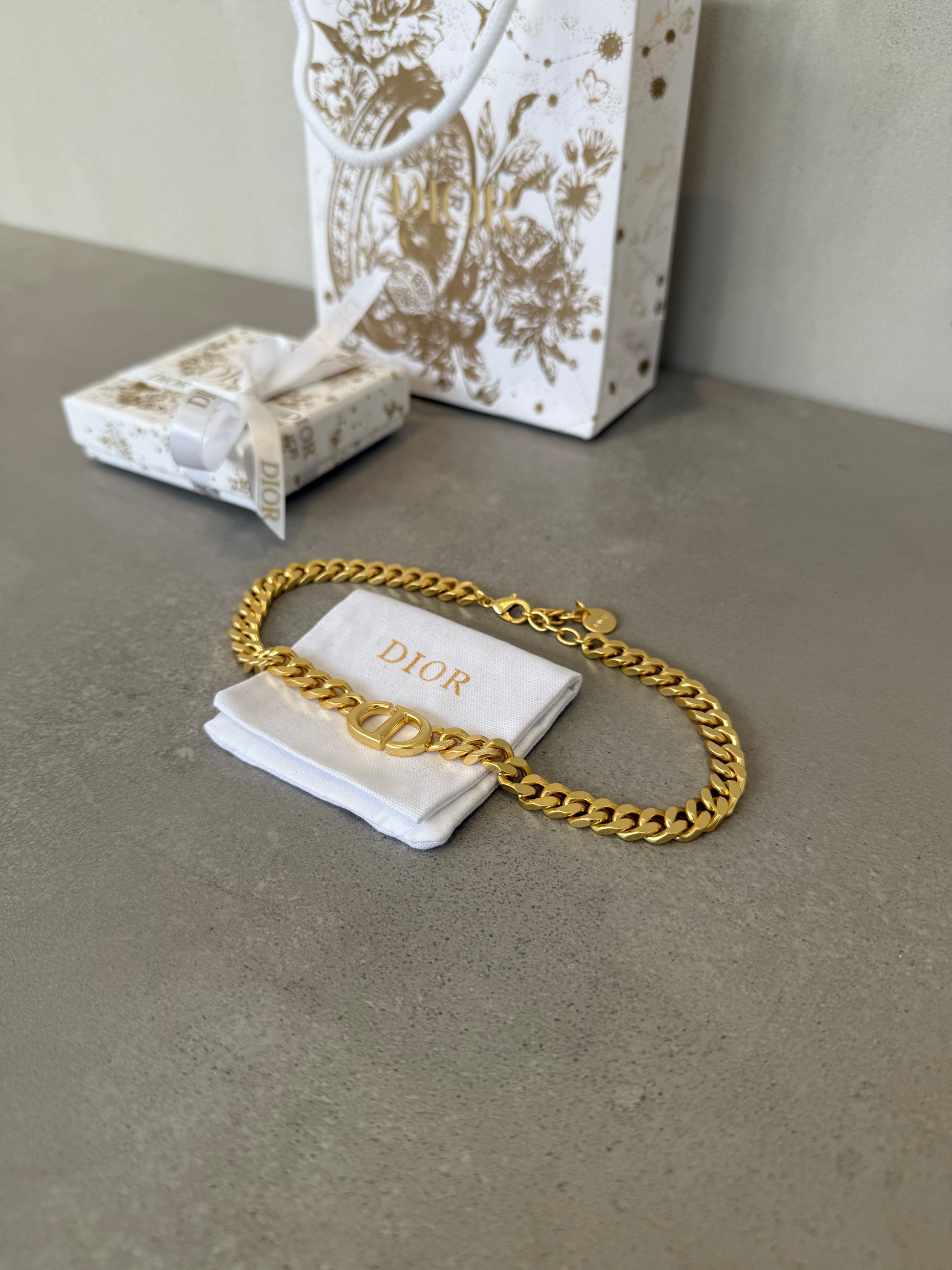 Este collar CD cubana dorada encarna la elegancia en su forma más pura. Su cadena de eslabones robustos y brillantes proyecta una presencia audaz y refinada, mientras que el distintivo logo CD al centro actúa como punto focal de sofisticación. El acabado dorado irradia calidez y lujo, creando un contraste perfecto entre la estructura geométrica de la cadena y la delicadeza del diseño. Versátil y atemporal, esta pieza se adapta tanto a looks minimalistas como a conjuntos más elaborados, consolidándose como un accesorio imprescindible que eleva cualquier estilo con su presencia distinguida.