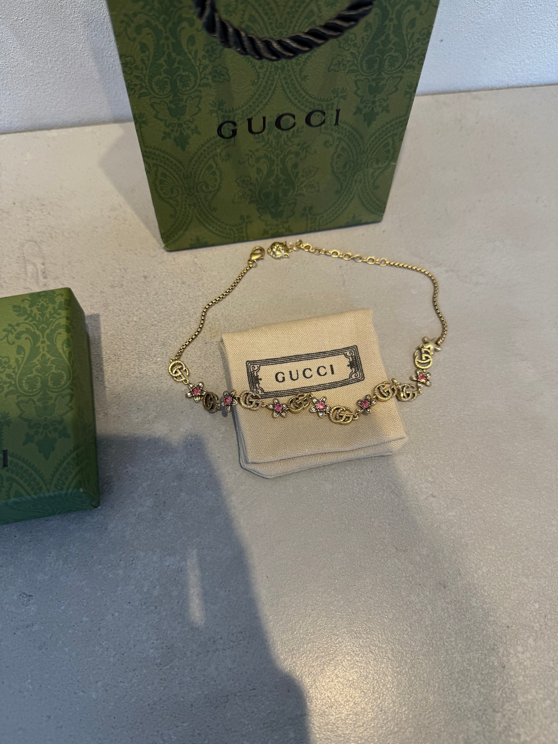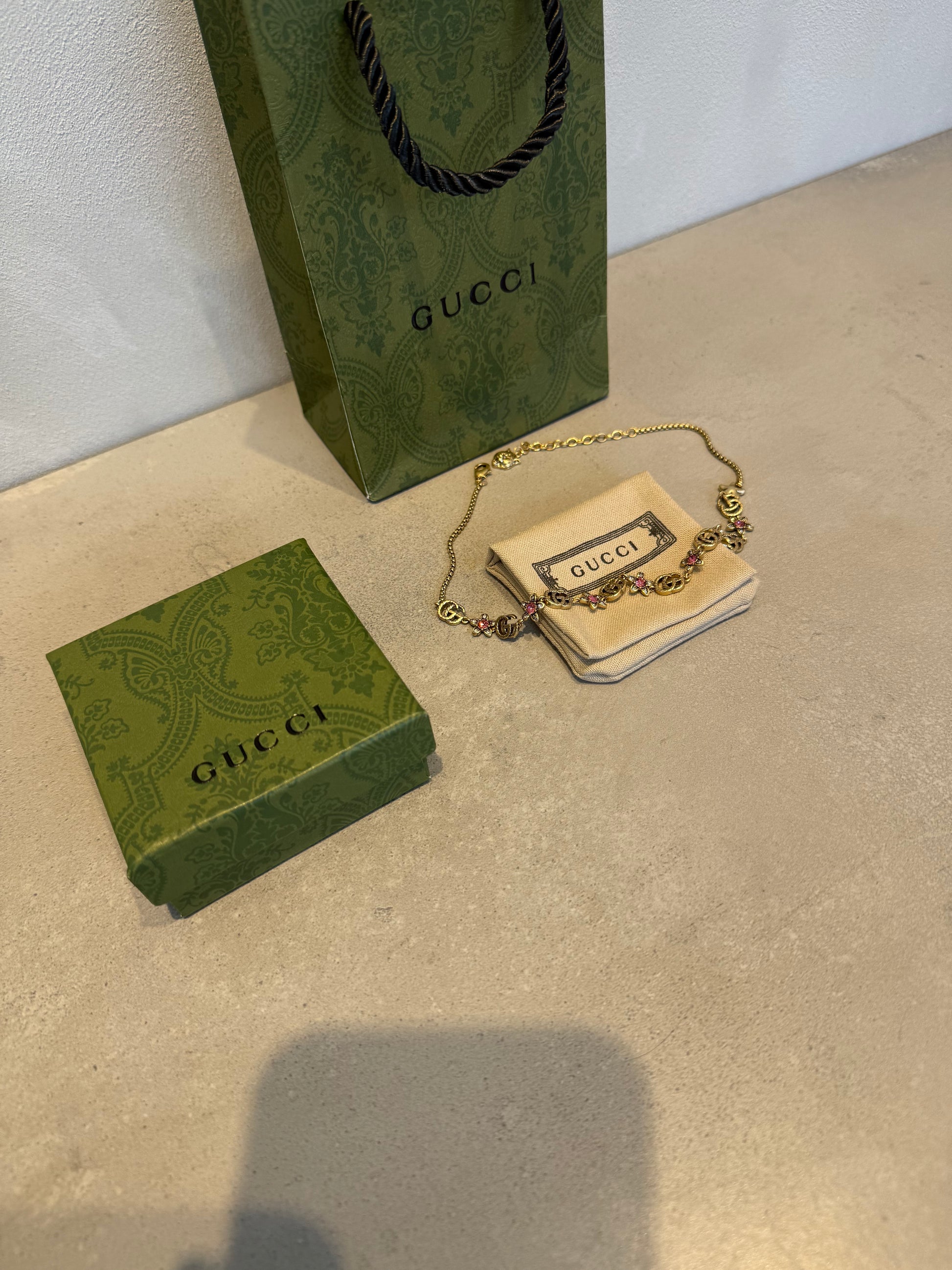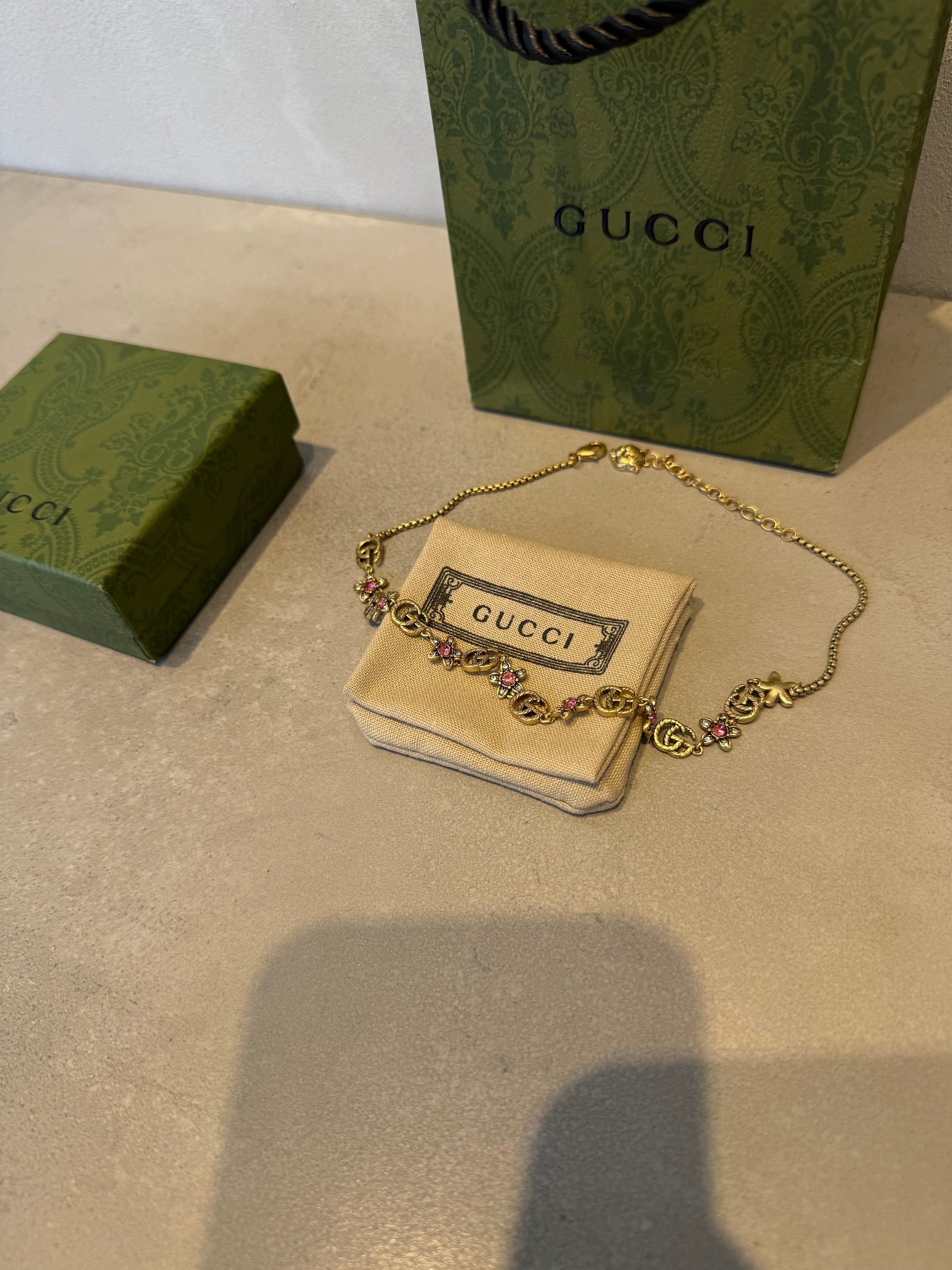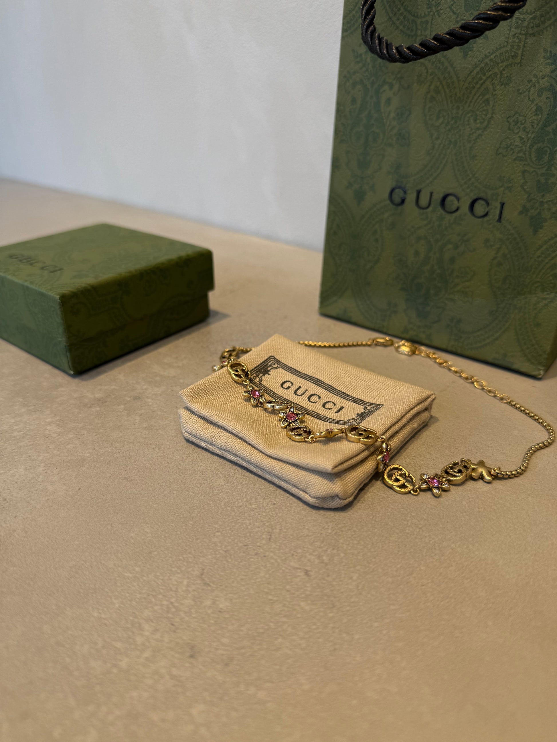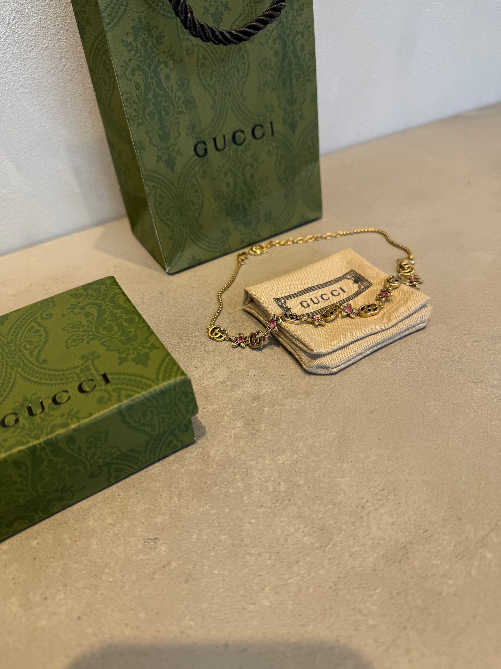 Este collar GG presenta un diseño refinado que fusiona el icónico logo de la marca con delicados detalles florales, creando una pieza de elegancia atemporal. Su acabado dorado irradia un brillo sofisticado que se adapta tanto a looks casuales como formales, convirtiéndolo en un accesorio versátil y esencial. La combinación de elementos clásicos y ornamentales transmite una sensación de lujo accesible, perfecta para quien busca añadir un toque de distinción a su estilo personal en cualquier ocasión.
