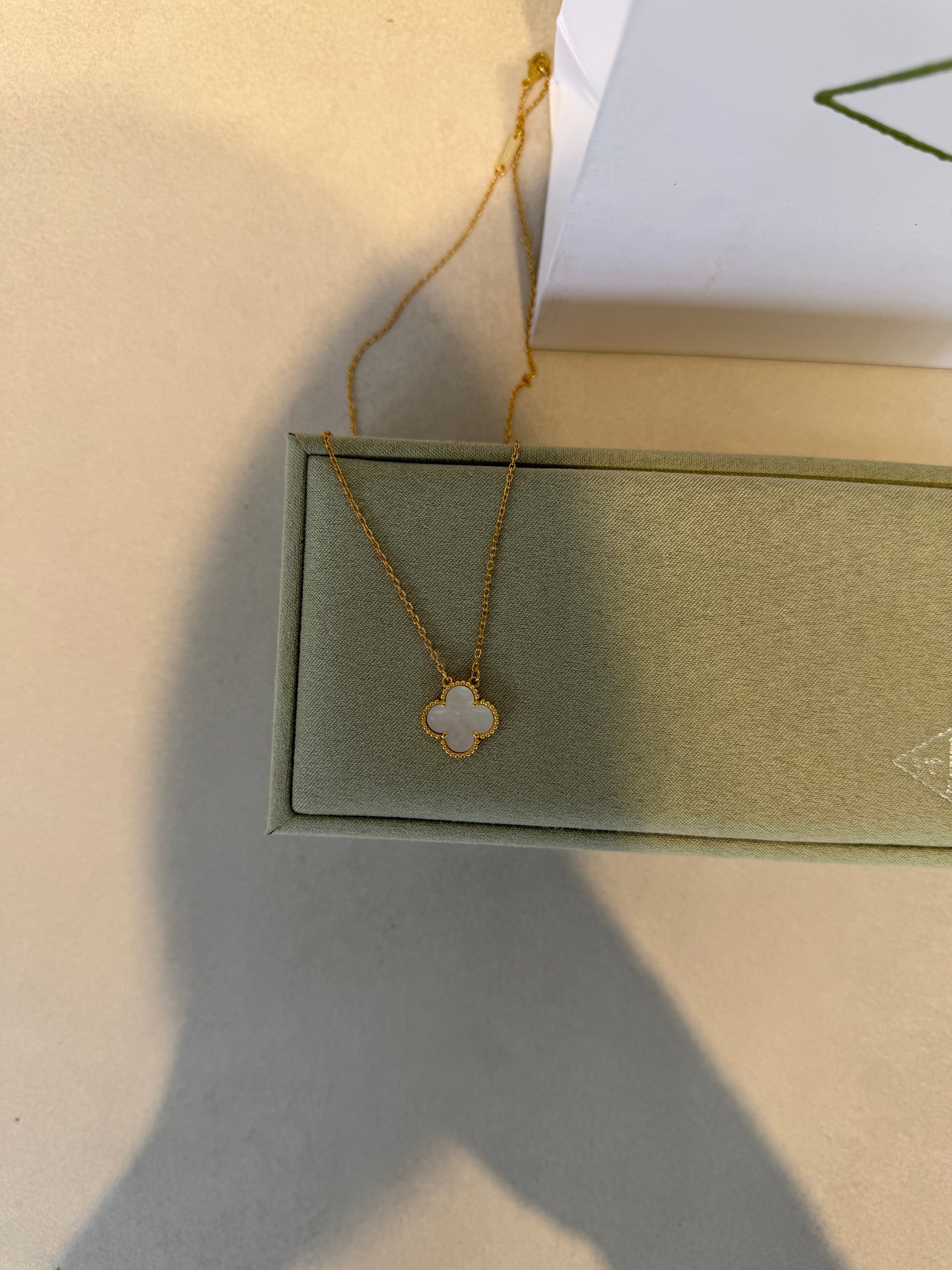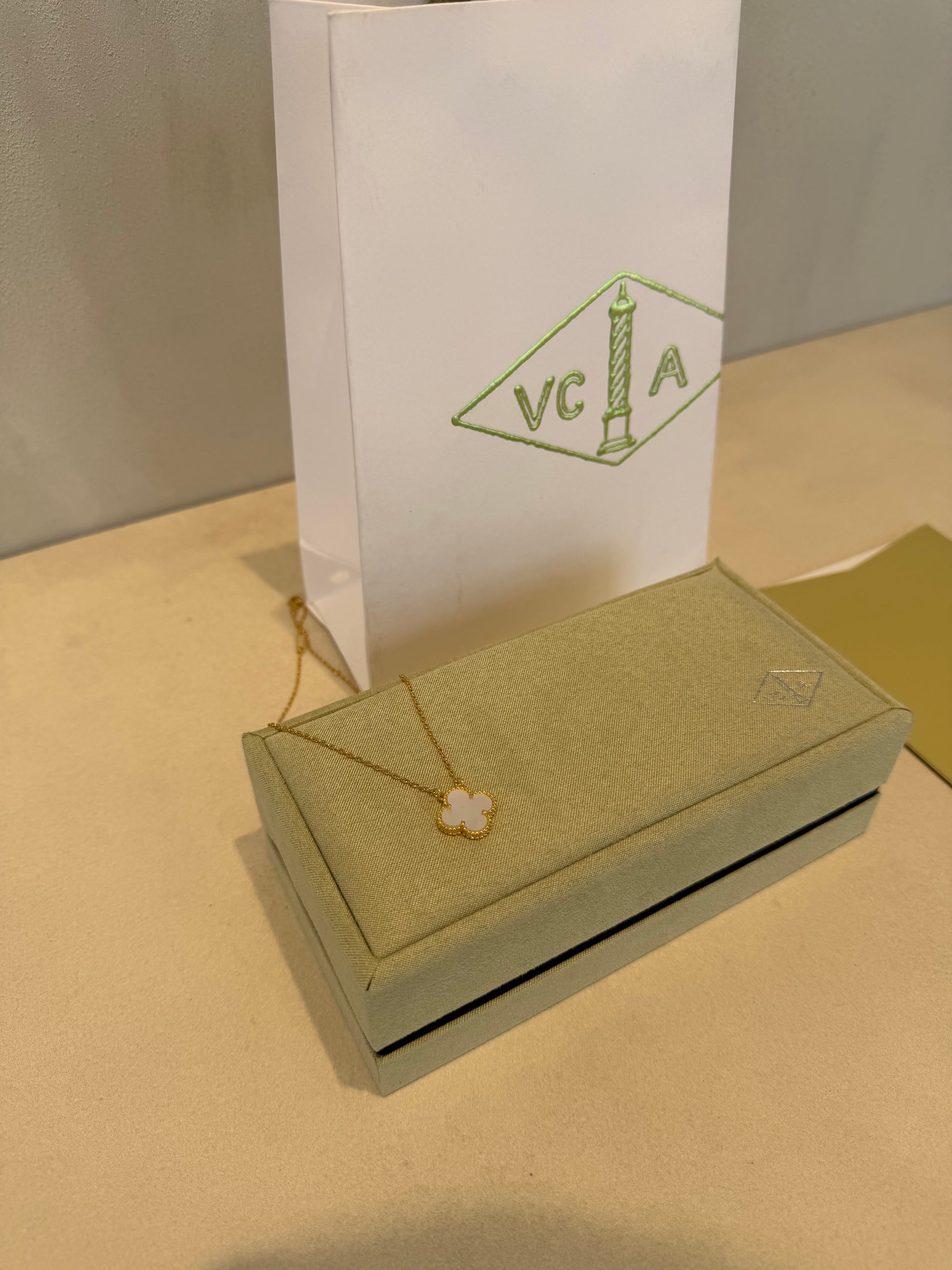 Este collar VCA blanco-dorado encarna la elegancia atemporal con su diseño refinado que fusiona elementos clásicos y contemporáneos. La combinación de detalles blancos con acabados dorados crea un contraste sofisticado que captura la luz con gracia, mientras su estructura equilibrada transmite una sensación de lujo accesible. Versátil y distinguido, este accesorio complementa tanto looks minimalistas como atuendos más elaborados, consolidándose como una pieza esencial para quien busca añadir un toque de distinción a su colección de joyas.