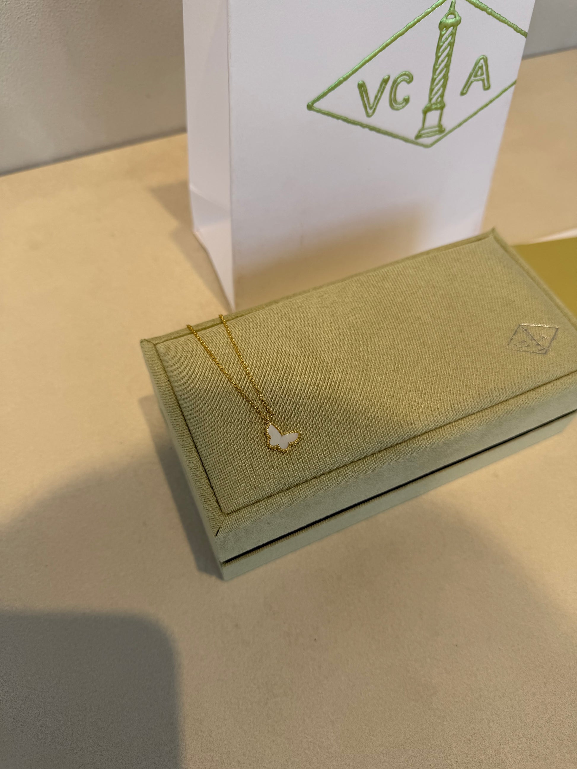 Este collar VCA mariposa pequeña encarna la elegancia minimalista con su diseño icónico de mariposa, símbolo de transformación y gracia. La pieza destaca por su acabado dorado que irradia sofisticación, mientras que su tamaño compacto la convierte en un accesorio versátil capaz de complementar tanto looks cotidianos como ocasiones especiales. Su estructura delicada refleja la maestría en joyería fina, posicionándola como una pieza atemporal que trasciende tendencias, perfecta para quien busca expresar su estilo con discreción y refinamiento.