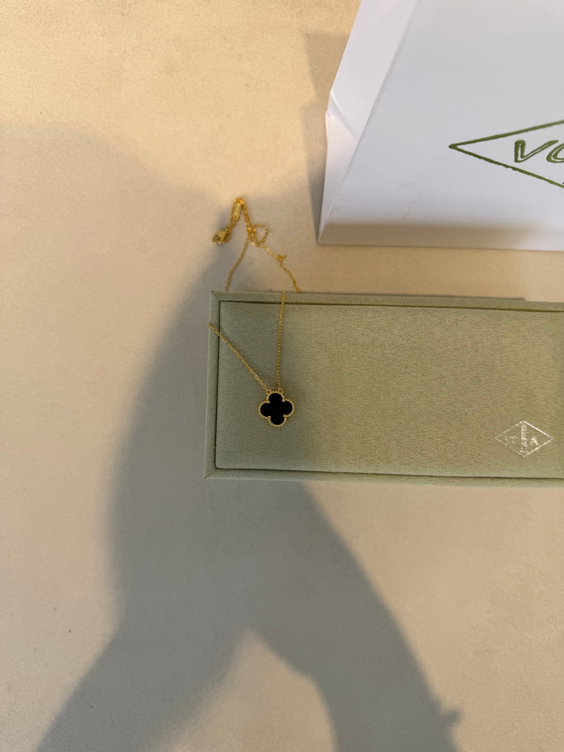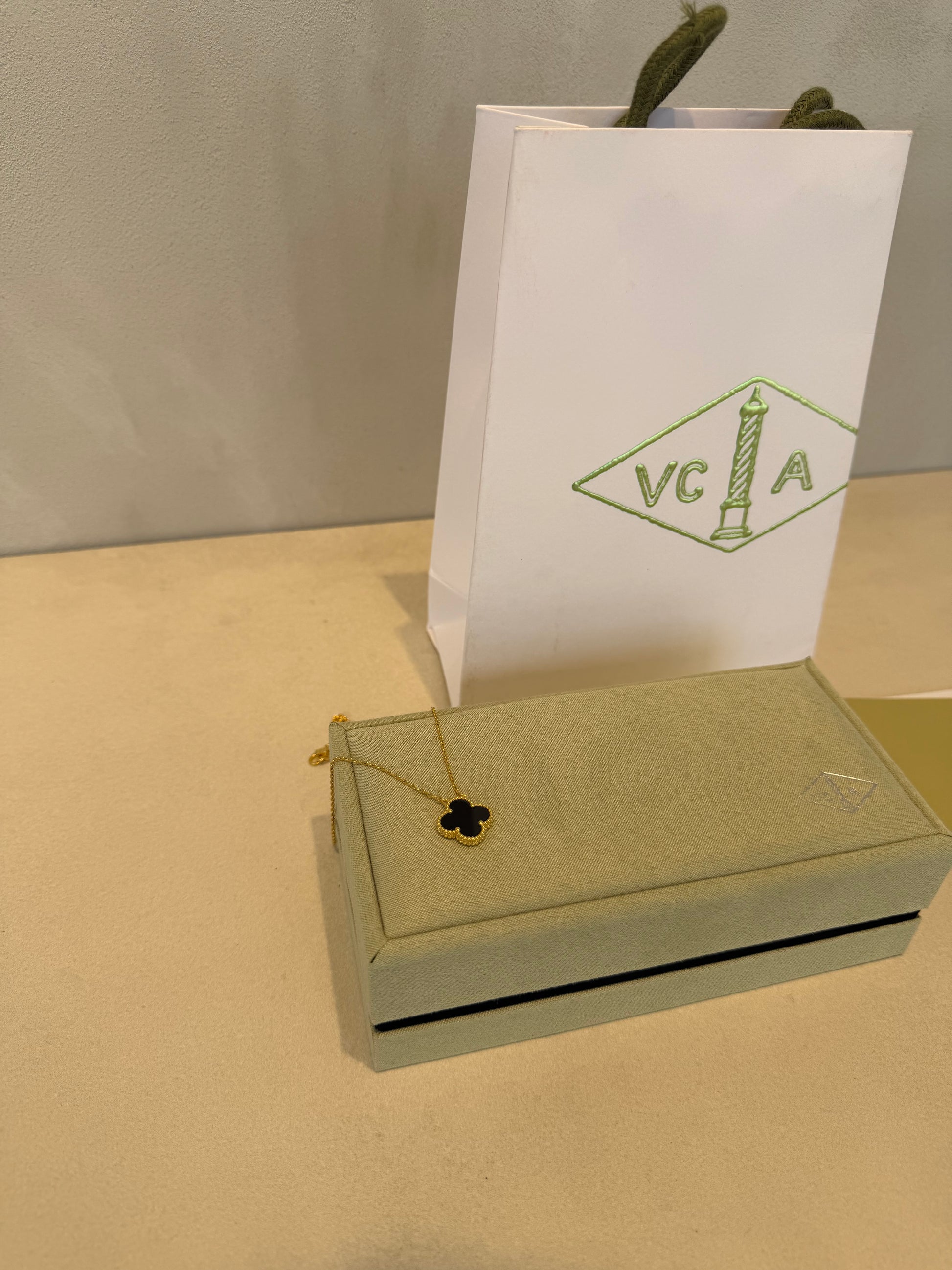 Este collar VCA negro encarna la elegancia minimalista con un toque de sofisticación contemporánea. Su diseño limpio y refinado presenta detalles que evocan lujo discreto, combinando la profundidad del negro con acabados que capturan la luz de manera sutil. La pieza transmite una sensación de distinción y modernidad, perfecta para quien busca un accesorio versátil que eleve tanto looks casuales como formales. Su estructura equilibrada lo convierte en una joya atemporal, ideal para quienes aprecian la calidad y el buen gusto en cada detalle.