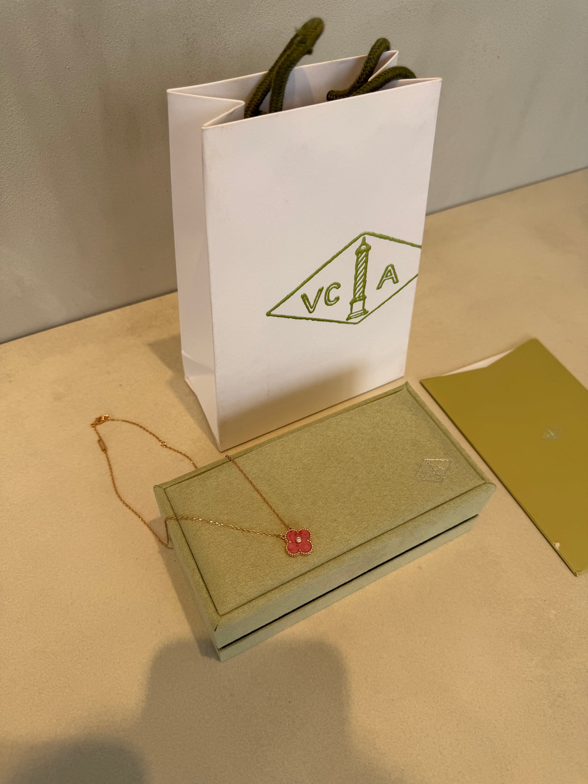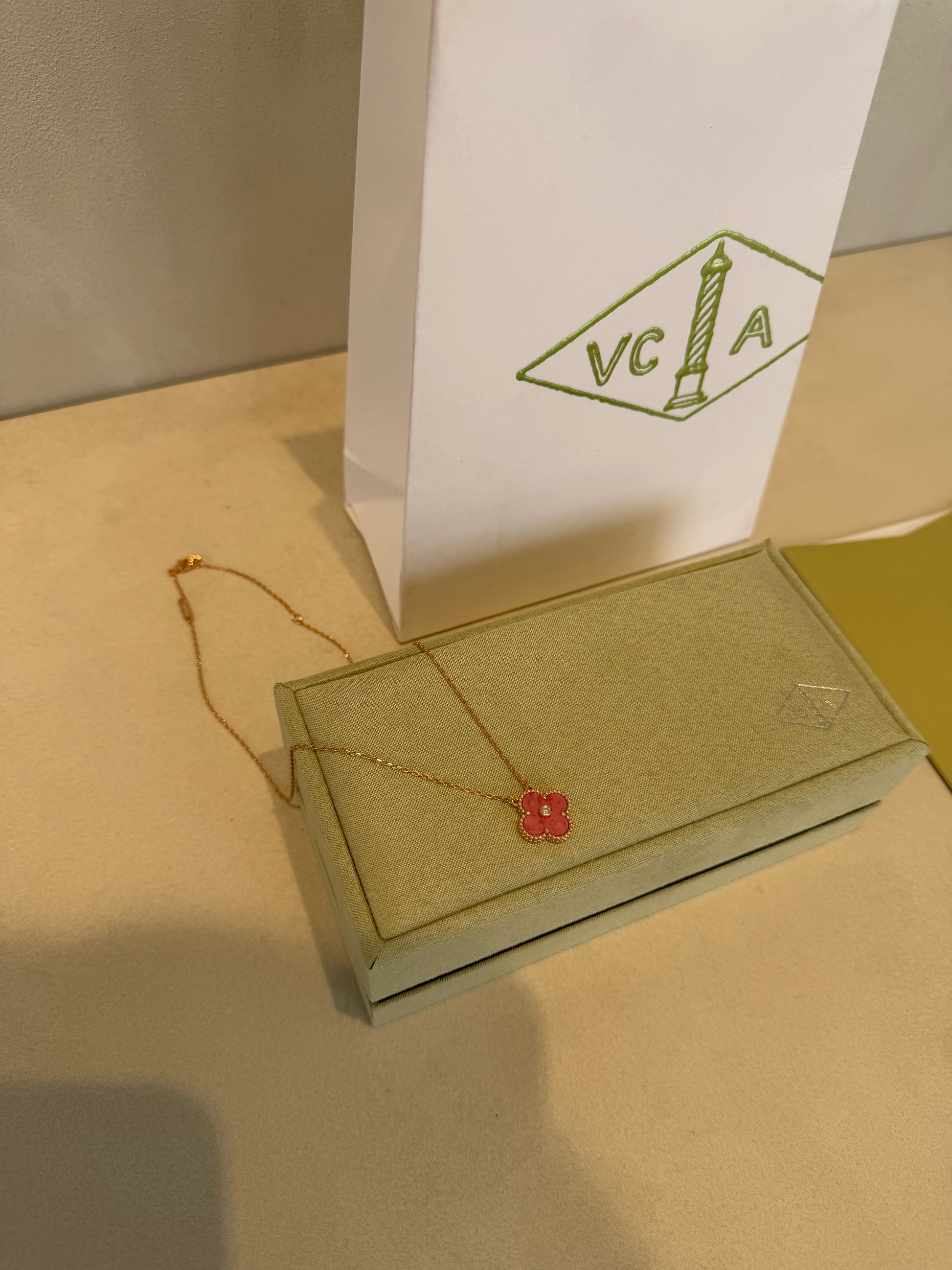 Este collar VCA roja encarna la elegancia atemporal con su diseño minimalista y sofisticado. La piedra roja central, símbolo de pasión y distinción, se complementa con detalles dorados que aportan un brillo cálido y refinado. Su estructura delicada y equilibrada lo convierte en una pieza versátil que transita sin esfuerzo entre looks casuales y formales, añadiendo un toque de lujo discreto a cualquier conjunto. Una joya que trasciende tendencias, perfecta para quien aprecia la calidad y el buen gusto.