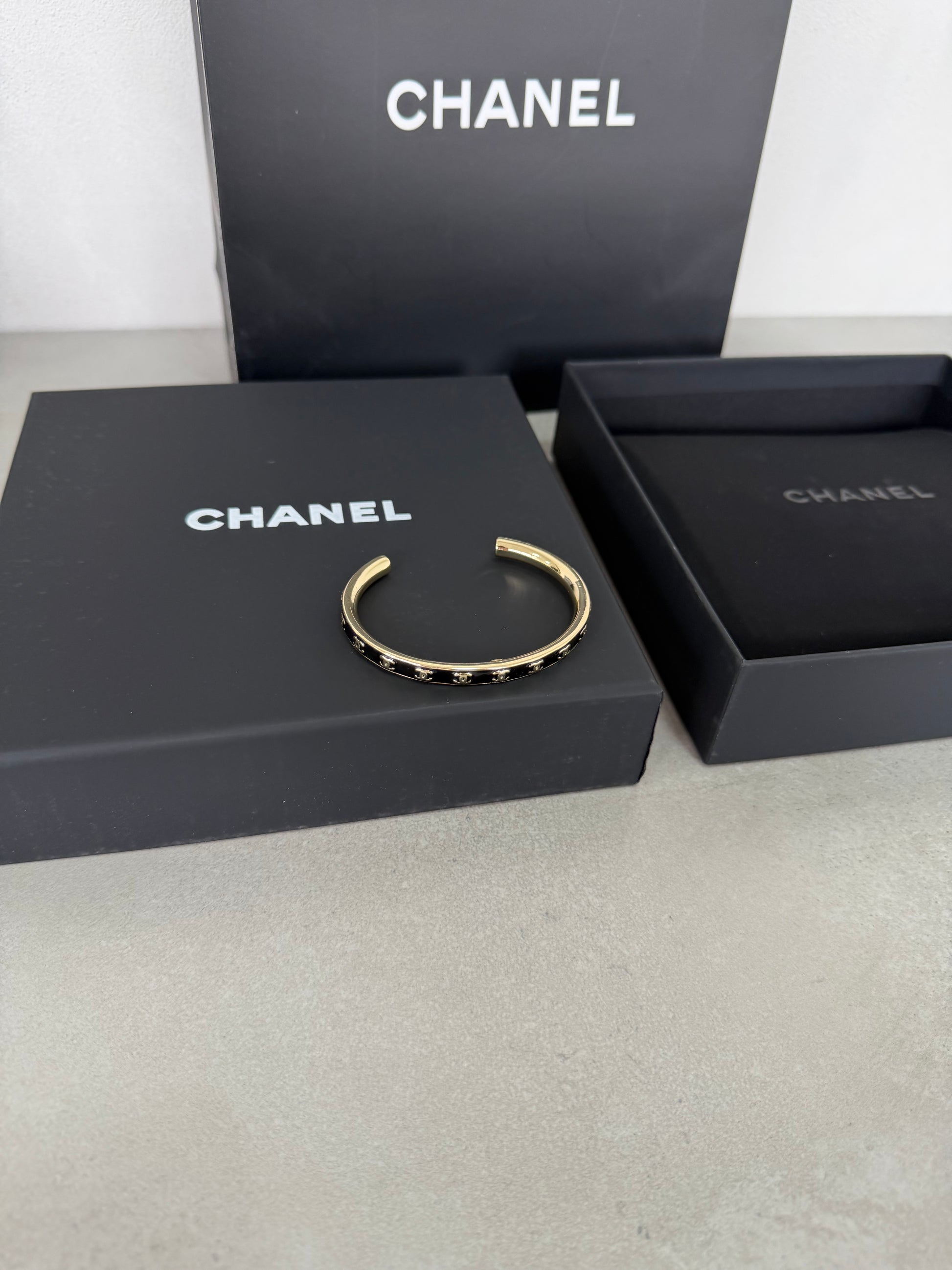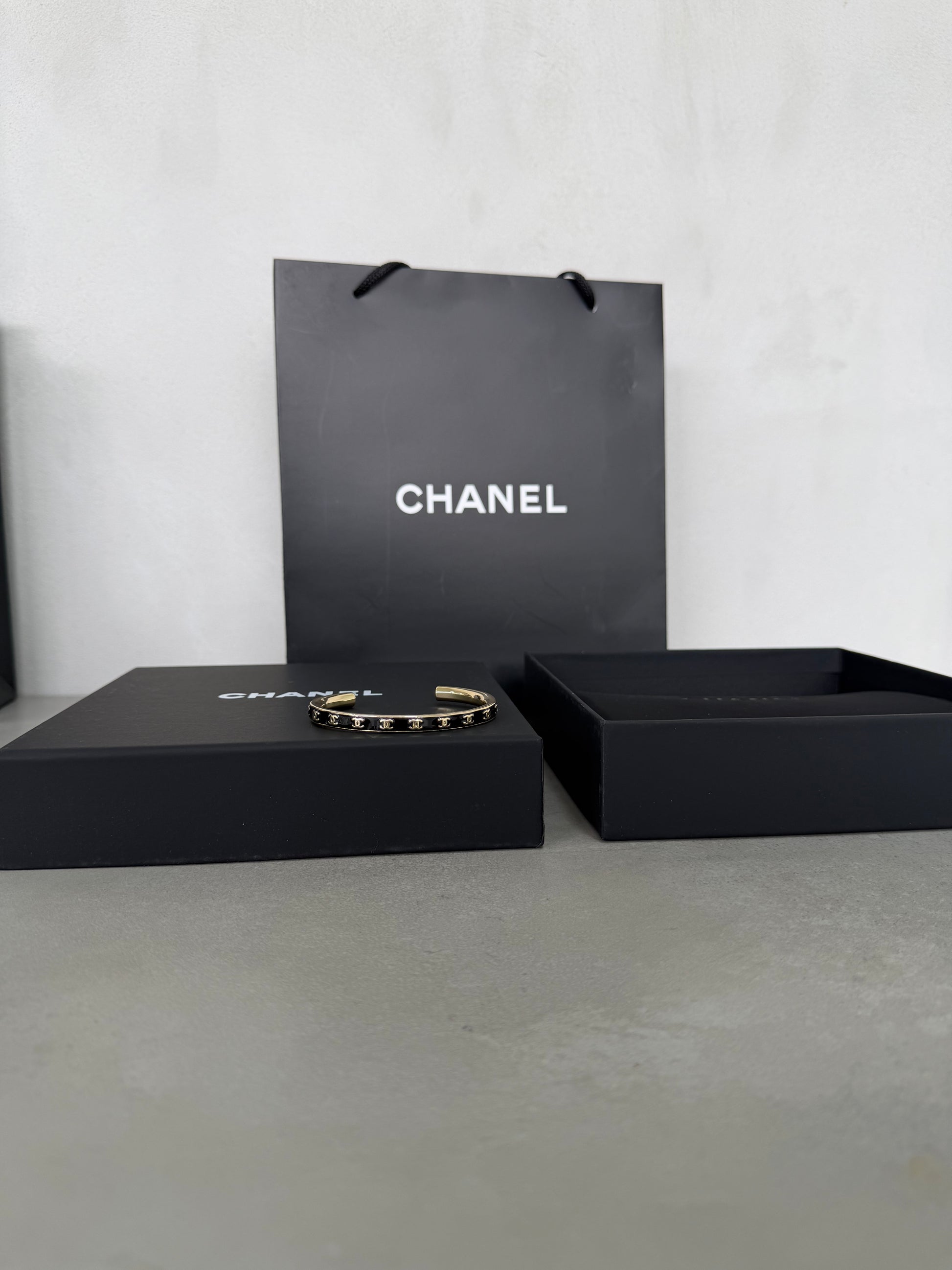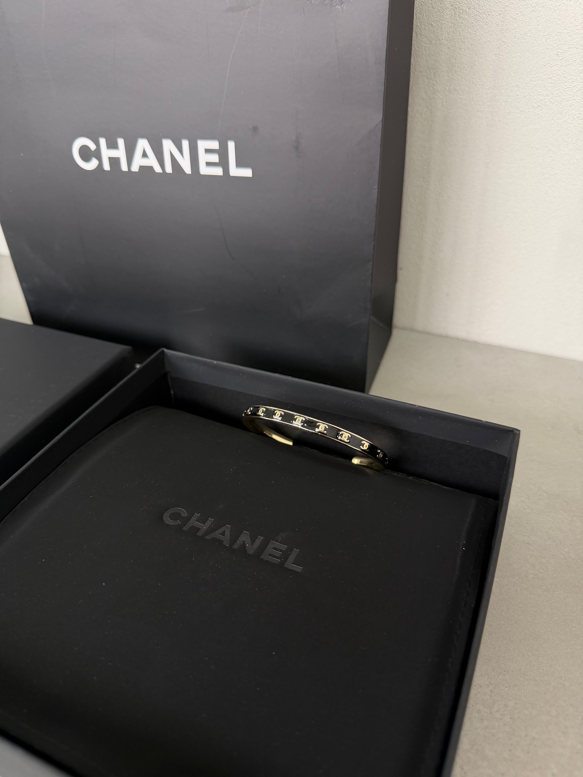 Esta pulsera CC encarna la elegancia minimalista con su diseño en tonos negros que transmite sofisticación y modernidad. El icónico logo CC se posiciona como protagonista, complementado por detalles que reflejan un estilo contemporáneo y refinado. Su acabado mate aporta una discreción lujosa que se adapta tanto a conjuntos casuales como a looks más formales, consolidándose como una pieza versátil y atemporal que eleva cualquier estilismo con su presencia discreta pero impactante.