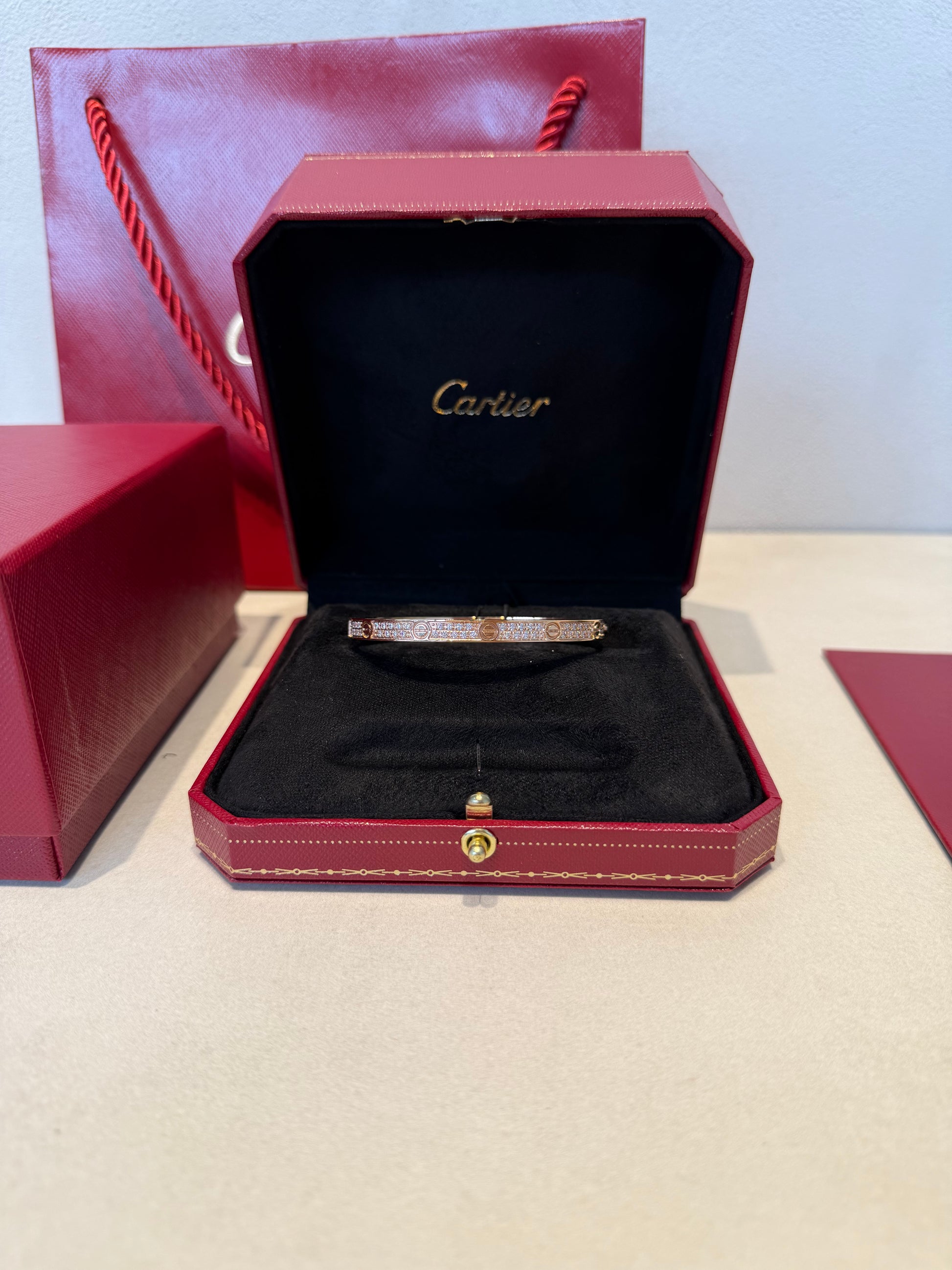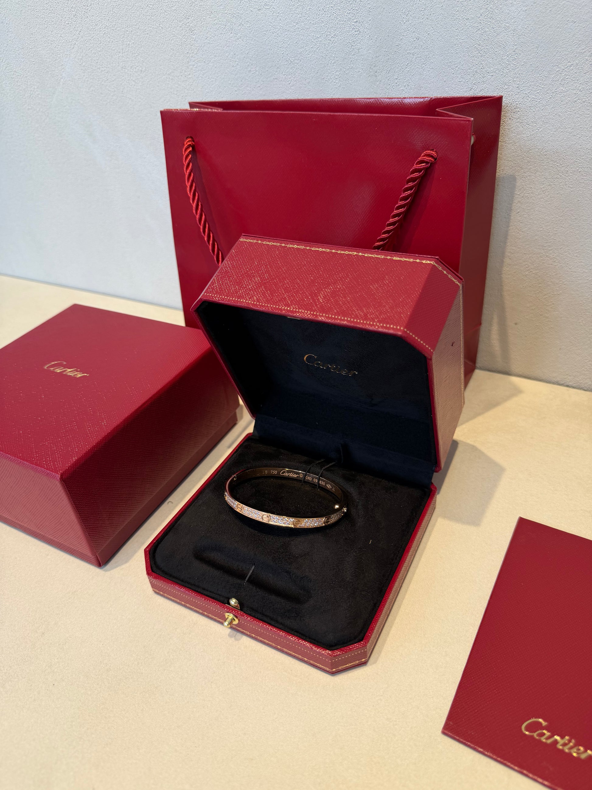 La pulsera CRT, con diamantes de talla pendiente, destaca por su diseño sobrio y un brillo que captura la luz en cada movimiento.