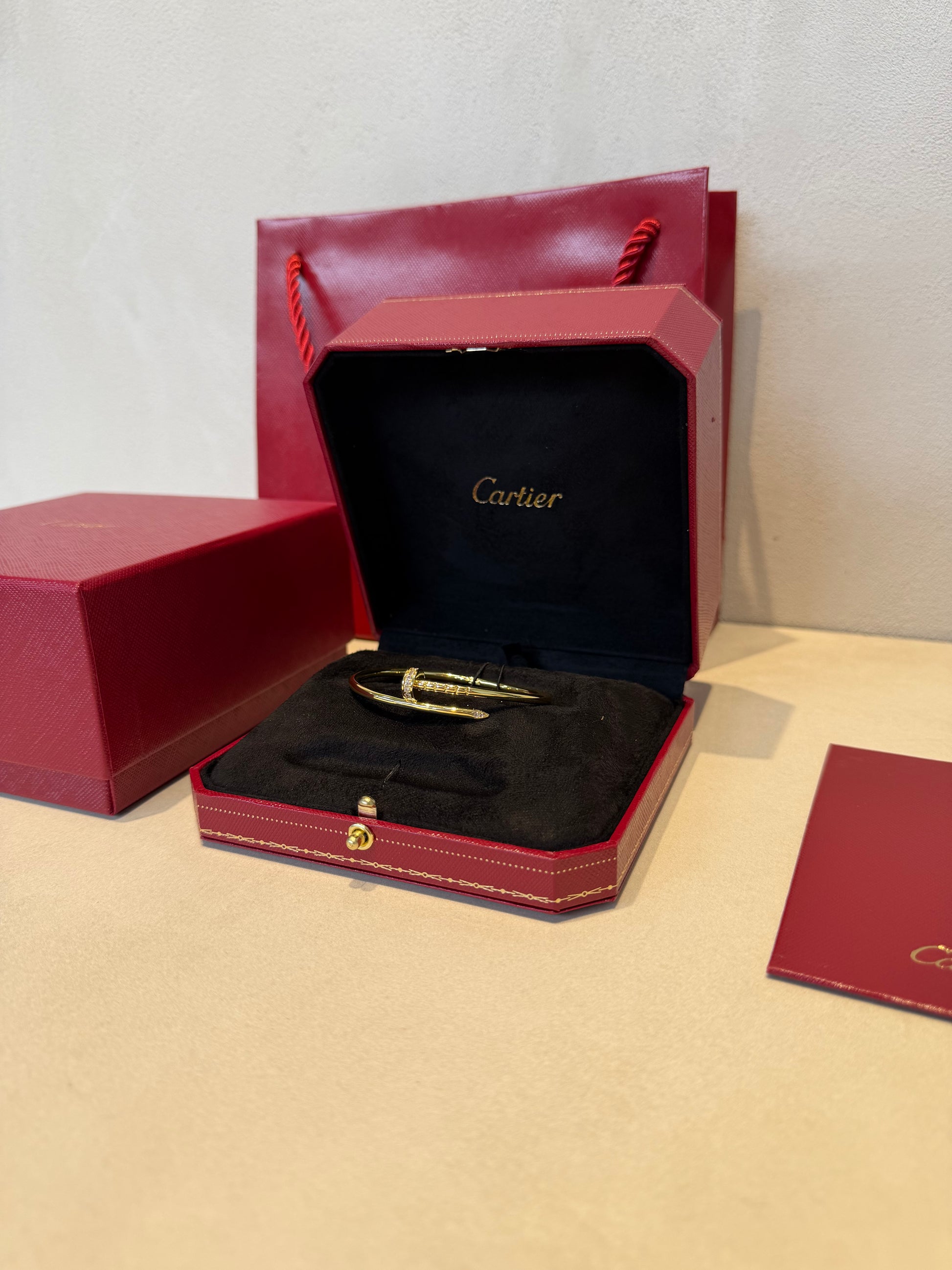 La pulsera CRT dorada con diamantes irradia una elegancia discreta y contemporánea. Su diseño presenta una línea limpia en acabado dorado, realzada por diamantes finamente engastados que capturan la luz con cada gesto.