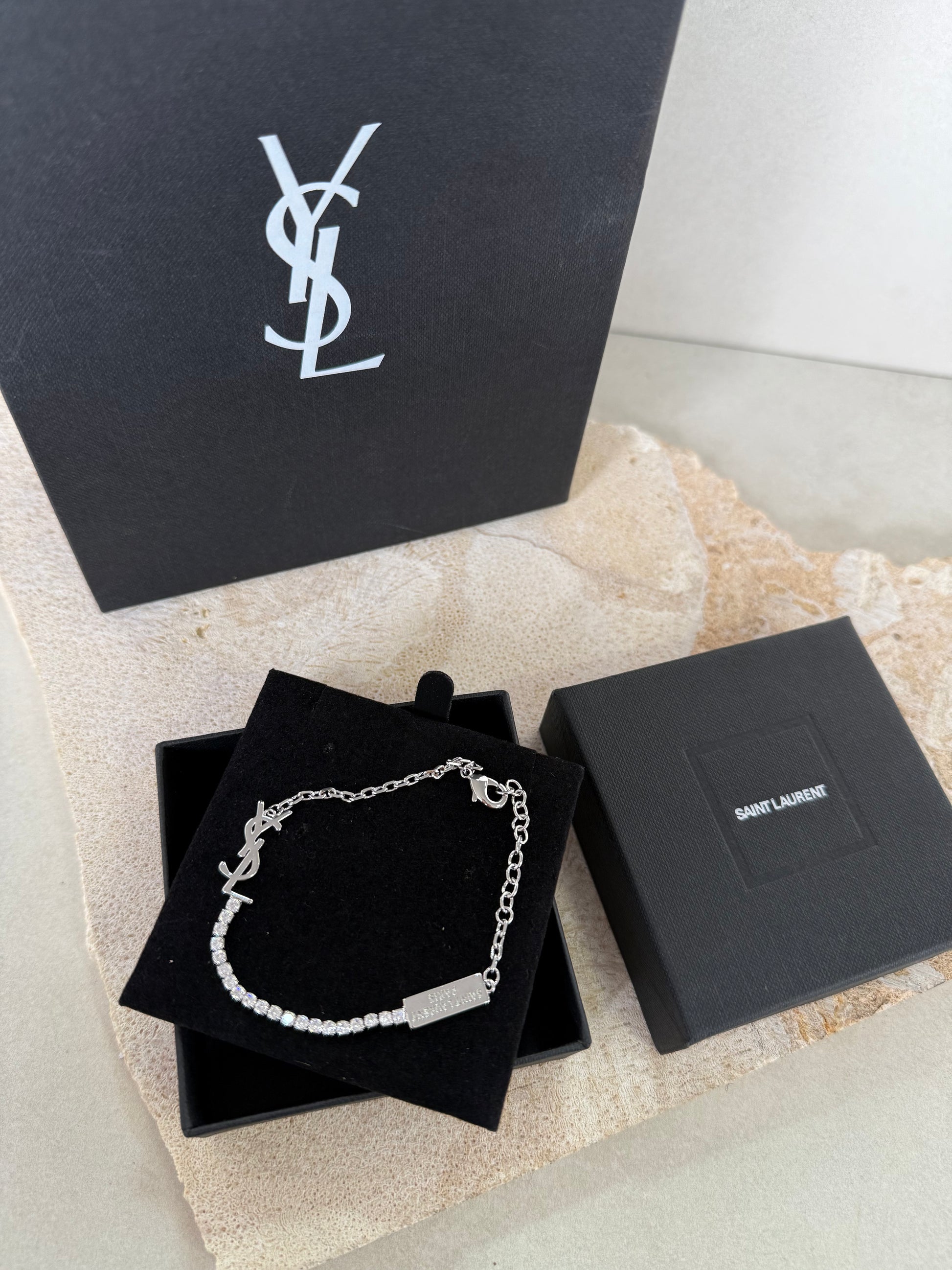 Esta pulsera YSL encarna la esencia del lujo minimalista con su diseño plateado refinado. Las icónicas siglas de la marca se presentan como elemento central, grabadas con precisión en una estructura elegante que refleja sofisticación. Su acabado plateado irradia un brillo discreto y atemporal, perfectamente versátil para complementar tanto atuendos casuales como formales. Una pieza de joyería que trasciende las tendencias, convirtiéndose en un accesorio imprescindible que añade distinción a cualquier muñeca con su presencia sutil pero inconfundible.